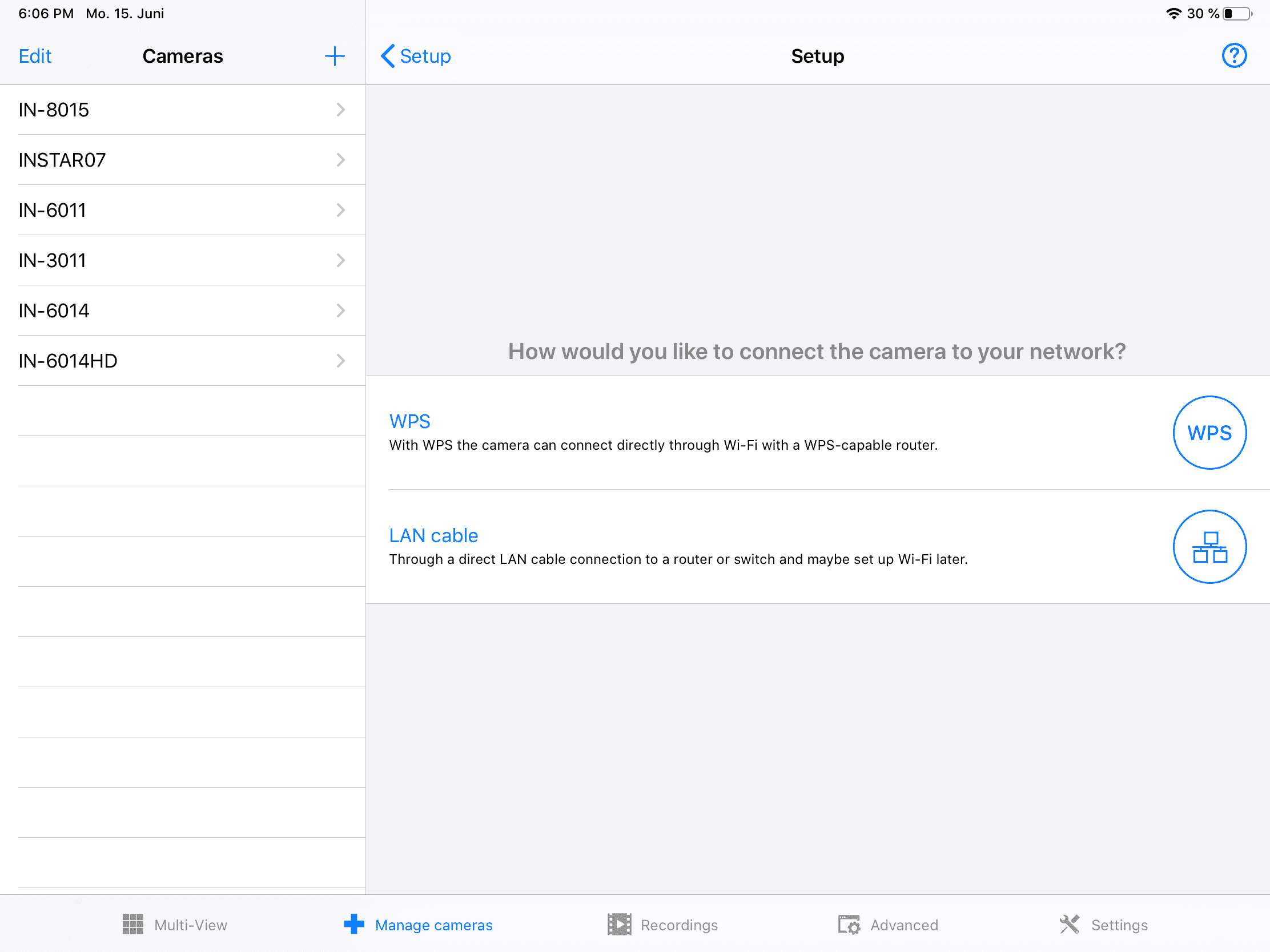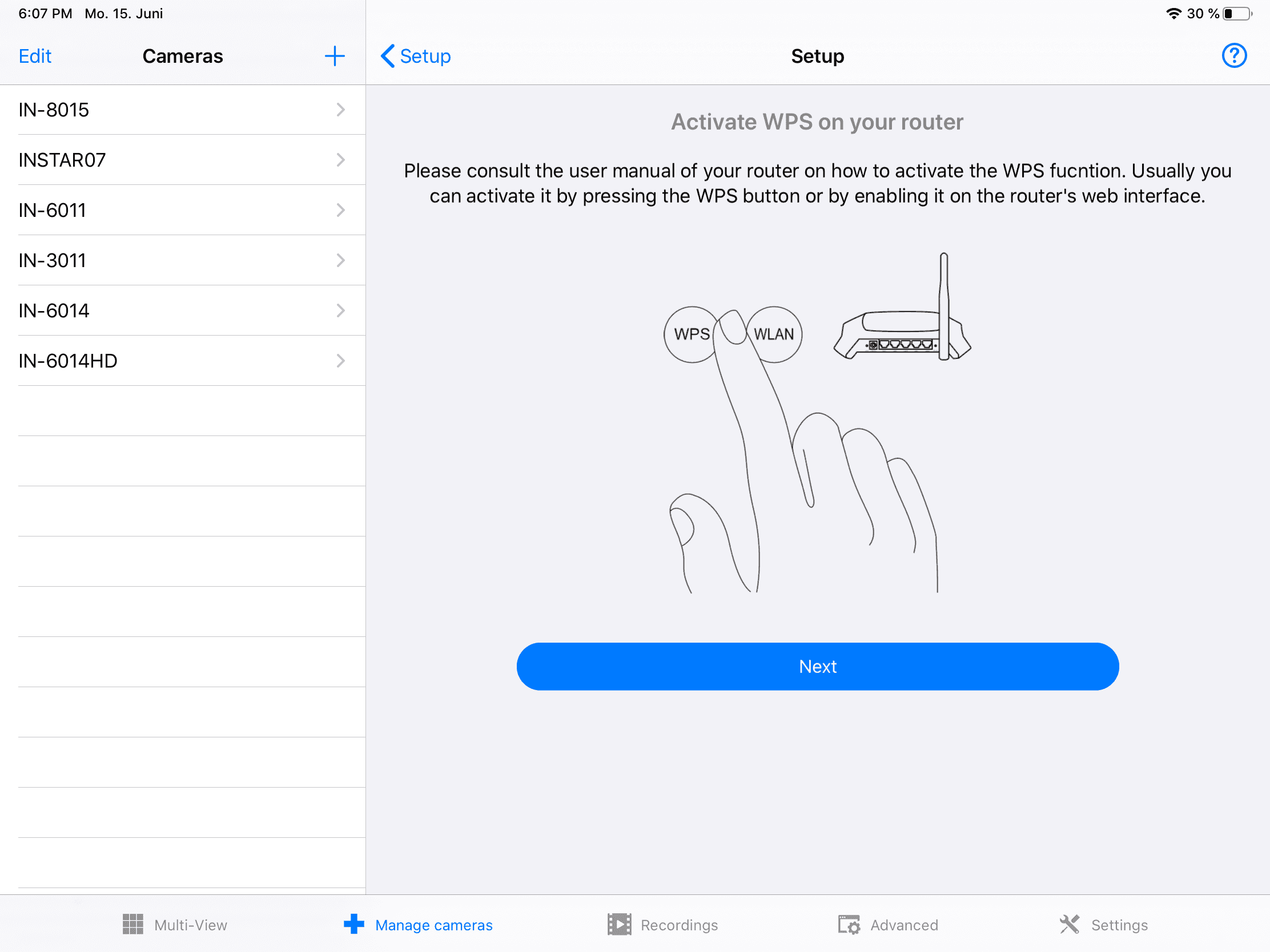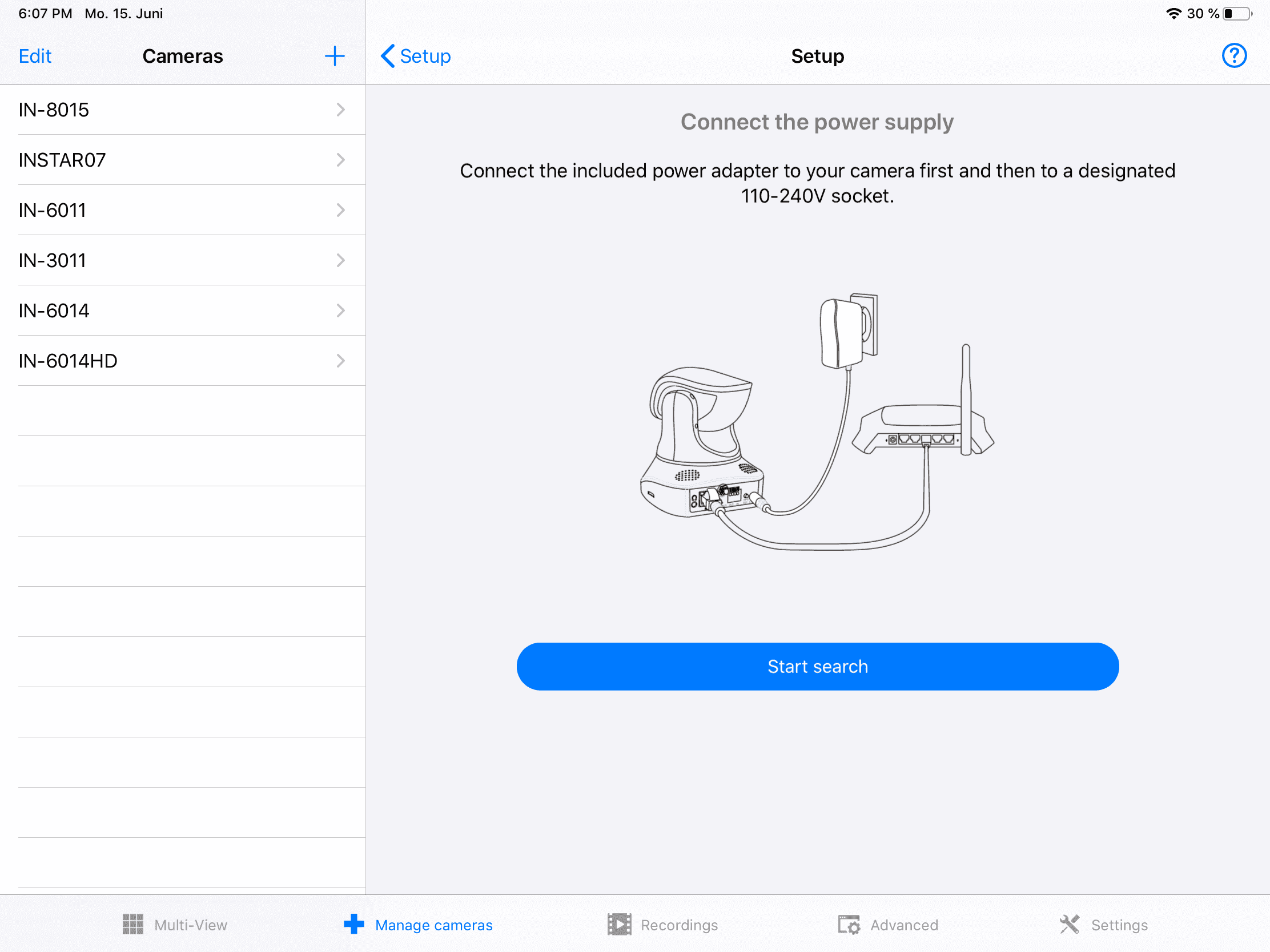 - [11] Sobald Sie [den WPS-Modus aktiviert haben] (/Schnell_Installation/Herstellen_der_WLAN_Verbindung/#plugplay-wps) sowohl auf Ihrer Kamera als auch auf dem Router klicken Sie auf Search und die App wird alle INSTAR-Kameras in Ihrem lokalen Netzwerk erkennen. Wenn Ihre Kamera nicht angezeigt wird, wählen Sie die Option manuell hinzufügen.