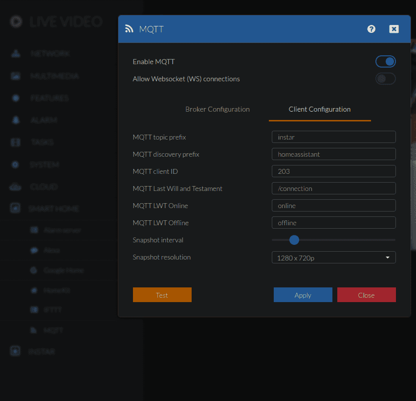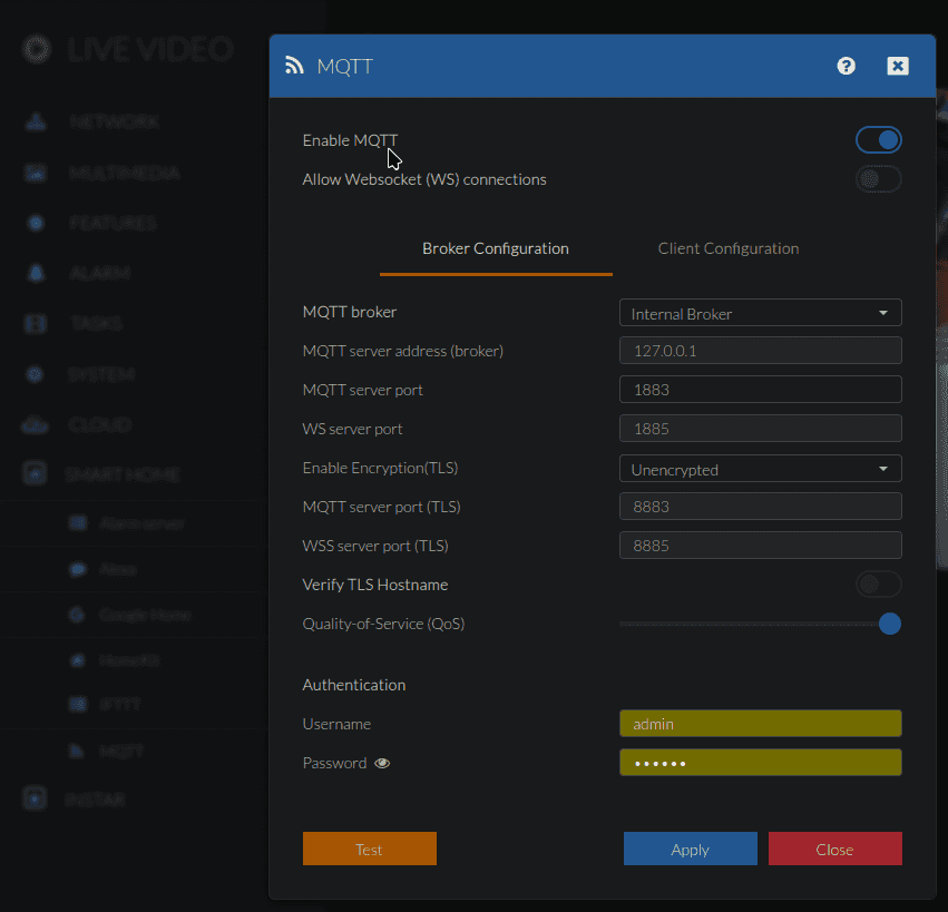 At this point, you should ensure that the MQTT service is active in the camera and that the camera is configured as an MQTT broker: